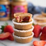 - Fill and swirl: Spoon the peanut butter mixture into each liner filling them up. Then place about 1/4 teaspoon of strawberry jam on top of each cup. Using a toothpick or sharp knife, gently swirl the jam into the peanut butter to create a marbled effect.