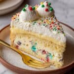 A slice of cake with three distinct layers sitting on a white plate with a brown rim. The bottom layer is a light yellow sponge with small red, blue, and purple pieces mixed into it. Above that is a thick layer of smooth, creamy yellow custard. The top layer is white whipped cream, decorated with colorful red, green, yellow, and white round sprinkles and three small peaks of whipped cream. Next to the cake slice is a golden fork, resting on the plate. The whole scene is set on a white marbled surface. photo taken with an iphone --ar 4:5 --v 7