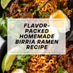 This Homemade Birria Ramen recipe combines the rich, flavorful Mexican birria stew traditionally made with slow-cooked beef and aromatic chiles with the comforting texture of Japanese ramen noodles. Tender, shredded chuck roast is simmered in a deeply spiced chile broth, served with ramen noodles, soft-boiled eggs, fresh jalapenos, cilantro, and lime for a fusion dish that is both hearty and satisfying.