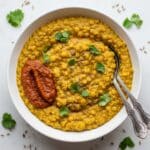 - Serve: Open the lid carefully, stir the khichdi gently, and serve hot. Top with an additional dollop of ghee for richness and garnish with chopped cilantro. This dish pairs well with papad and pickle on the side.