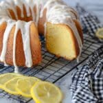 A golden brown bundt cake with a smooth white icing glaze dripping down the ridges, sitting on a black cooling rack over a white marbled surface. One slice of the cake is cut, revealing a soft, moist, light yellow inside texture. In front of the cake, there are three bright yellow lemon slices placed on the cooling rack. A black and white checkered cloth lies partially in the lower right corner, adding a cozy touch. photo taken with an iphone --ar 4:5 --v 7