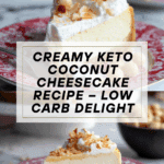 This Keto Coconut Cheesecake is a rich, creamy dessert perfect for low-carb and keto diets. Featuring a macadamia nut and coconut crust, a smooth coconut-infused cream cheese filling, and a luscious whipped cream topping garnished with toasted coconut flakes, this cheesecake is both indulgent and sugar-conscious. Baked gently with a water bath to ensure a silky texture, it’s a tropical treat ideal for special occasions or anytime you crave a sweet keto-friendly dessert.