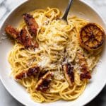 A white round pan filled with creamy yellow spaghetti noodles, glistening with sauce, is placed on a white marbled surface. The spaghetti is lifted in the air by silver tongs, showing smooth, well-coated strands slightly twisted and hanging down. In the background, there are halved grilled lemons with a golden-brown char and some blurred white and black striped cloth. The light is bright and natural, highlighting the glossy texture of the pasta. photo taken with an iphone --ar 4:5 --v 7