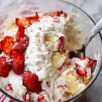 A clear glass bowl shows a mix of creamy white whipped topping, bright red sliced strawberries, and soft yellow cake chunks all combined. The strawberries look juicy and fresh, some placed around the edge of the bowl with visible seeds and green bits on the tops. The creamy layer is thick and fluffy, covering the cake and fruit unevenly, making the texture look smooth and soft. A metal spoon is partially buried in the mix, with the handle resting on the side of the bowl. The background is a white marbled texture with a red and white striped cloth partially visible under the bowl. Photo taken with an iphone --ar 4:5 --v 7