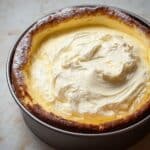 A creamy cheesecake with a golden-brown baked crust forms the outer layer, about two inches high, with a slightly uneven edge dusted lightly with powdered sugar. Inside, there is a thick, smooth, pale yellow cream layer almost filling the crust, topped with a soft, glossy, and fluffy off-white cream layer that appears freshly spread, creating gentle peaks and swirls. The cheesecake sits in a round metal pan on a white marbled surface. photo taken with an iphone --ar 4:5 --v 7