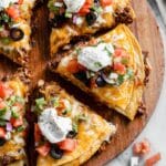 This Mexican Pizza recipe is a delicious Taco Bell copycat featuring layers of crispy corn tortillas, seasoned ground beef, refried beans, enchilada sauce, and melted cheddar cheese. Topped with fresh tomatoes, sliced olives, and green onions, this homemade version offers all the flavor of the fast-food favorite with the comfort of a homemade meal.