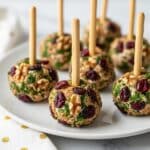8. Add Pretzel Sticks: To make serving easy, insert a pretzel stick into the top of each cheese ball. This step is optional but adds a fun presentation and convenient handle for guests.