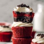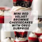 These Mini Red Velvet Brownie Cheesecakes are a delightful combination of rich chocolate, creamy cheesecake, and a hint of classic red velvet flavor. Perfectly portioned and topped with a luscious cream cheese whip and crushed OREO cookies, they make an irresistible treat for any occasion.