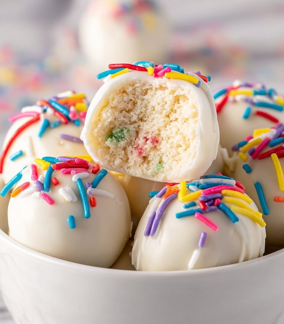 A white plate holds a pile of round cake balls coated in smooth white chocolate. Each ball is decorated with bright, colorful sprinkles in green, red, blue, yellow, purple, pink, and white on top, creating a lively contrast against the white coating. The cake balls appear soft and moist inside, as one ball in the center is cut open, revealing a crumbly beige cake with tiny, colorful sprinkles baked inside. The plate is placed on a white marbled surface, with a slightly blurred white bowl filled with more sprinkles in the background. photo taken with an iphone --ar 4:5 --v 7
