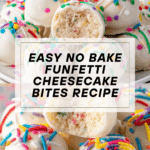 Keywords: no bake cheesecake bites, funfetti cheesecake, cheesecake balls, easy no bake dessert, party dessert, cream cheese bites, almond bark coating
