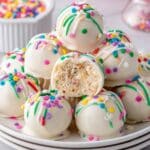 Keywords: no bake cheesecake bites, funfetti cheesecake, cheesecake balls, easy no bake dessert, party dessert, cream cheese bites, almond bark coating