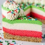 This No-Bake Christmas Cheesecake is a festive, colorful dessert perfect for holiday celebrations. Layers of creamy cheesecake in traditional red, white, and green colors sit atop a buttery graham cracker crust, and the cheesecake is beautifully finished with vanilla frosting and Christmas sprinkles. This easy-to-make, chilled dessert requires no baking, making it a convenient holiday treat that’s as delightful to look at as it is to eat.