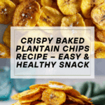 Crispy, golden-baked plantain chips seasoned simply with olive oil and kosher salt. These homemade chips are thinly sliced and baked to perfection for a light and crunchy snack that’s perfect for serving warm or at room temperature.