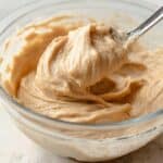 A clear glass bowl filled with a thick, creamy light brown mixture with smooth, swirled texture, and a metal spoon is lifting a dollop of the mixture, showing its soft and fluffy consistency. The bowl sits on a white marbled surface. photo taken with an iphone --ar 4:5 --v 7