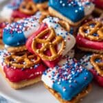A pile of small square cookies, each topped with a shiny golden brown pretzel, placed on a white plate with a white marbled background. The cookies are coated halfway with thick colorful icing in three different colors: bright red, deep blue, and white. Each cookie’s icing is decorated with tiny round sprinkles in red, white, and blue colors scattered on top. The layers show the pale beige cookie base, the smooth and glossy colored icing covering half the cookie’s top, and the pretzel sitting perfectly across the icing and cookie, creating a textured and layered look. Photo taken with an iphone --ar 4:5 --v 7