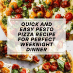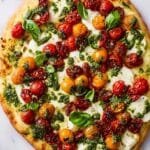This vibrant Pesto Pizza recipe features a crispy homemade or store-bought pizza dough base brushed with flavorful basil pesto, topped with fresh mozzarella cheese, roasted cherry tomatoes, and finished with fresh basil and red pepper flakes. Baked to perfection in a hot oven, it’s a fresh and delicious take on a classic favorite, perfect for a quick and satisfying meal.