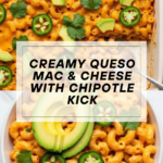 This creamy Queso Mac & Cheese combines sharp cheddar and Monterey Jack cheeses with a smoky chipotle kick for a flavorful twist on a classic comfort food. Featuring a luscious cheese sauce made with cream cheese and spiced with cumin and adobo, this baked macaroni dish is perfect for sharing and garnished with fresh avocado, pickled jalapeños, and cilantro for a vibrant finish.