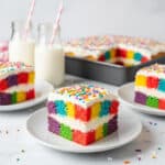 Store the Rainbow Poke Cake in an airtight container in the refrigerator for up to 3 days. When ready to serve, you can enjoy it cold or let it sit at room temperature for 15–20 minutes for a softer texture. Avoid freezing as the pudding filling may change consistency.