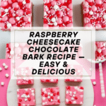 This Raspberry Cheesecake Chocolate Bark combines creamy white chocolate tinted with a soft pink hue, infused with rich raspberry and cheesecake flavorings. Loaded with crunchy vanilla cookie gems and soft mini marshmallows, and topped with colorful sprinkles and edible glitter, this bark is a delightful treat perfect for gifting or celebrating special occasions.