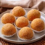 - Drain and Cool: Using a slotted spoon, remove the cooked sesame balls from the oil and place them on a wire rack or paper towel-lined plate. Let them cool for about 10 minutes before serving as they will be very hot inside.