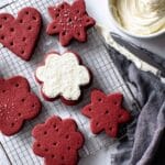 Keywords: red velvet cookies, cream cheese frosting, holiday cookies, soft cookies, red velvet dessert