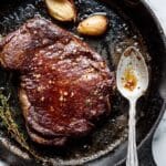 - Flip and baste the steak: Flip the steak to the other side, then add the unsalted butter to the skillet. Grasp the handle using a thick kitchen towel or oven mitt and tilt the pan slightly so the butter pools at the bottom. Add crushed garlic cloves and thyme sprigs to the butter pool. Use a large metal spoon to continuously baste the frothing butter over the steak, garlic, and herbs until the steak is glistening and aromatic, about 30 seconds.