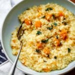 Keywords: butternut squash risotto, roasted squash risotto, baked risotto, vegetarian risotto, autumn recipes, creamy risotto, sage garnish