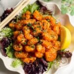It’s best to enjoy this dish fresh for maximum crispiness. If you need to store leftovers, keep the fried shrimp and sauce separate in airtight containers in the refrigerator for up to 1 day. Reheat shrimp briefly in a hot oven to restore some crunch, and add sauce fresh before serving.
