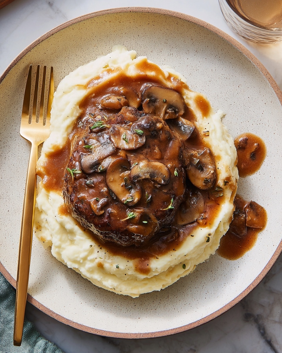 Keywords: Salisbury steak, ground beef patties, mushroom gravy, comfort food, pan-seared steak
