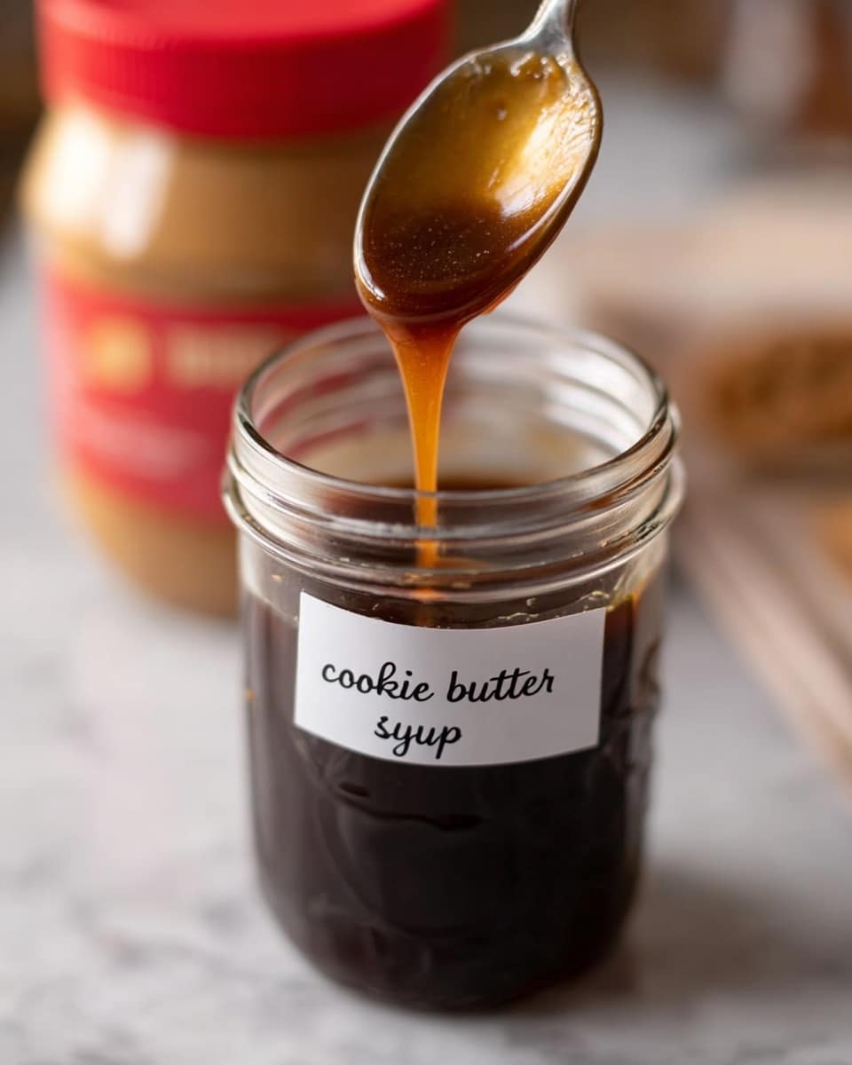 4. Strain for Smoothness: Allow the syrup to cool for 10 minutes. Then pour it through a fine mesh strainer into a clean glass jar or squeeze bottle, filtering out any remaining cookie butter sediment. For an extra smooth syrup, strain it a second time.