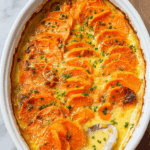 This creamy scalloped sweet potatoes recipe is a comforting side dish that features thinly sliced sweet potatoes baked in a rich garlic Parmesan cream sauce topped with melted Colby Jack cheese. Perfectly tender and flavorful, it’s an ideal dish for holiday dinners or cozy family meals.
