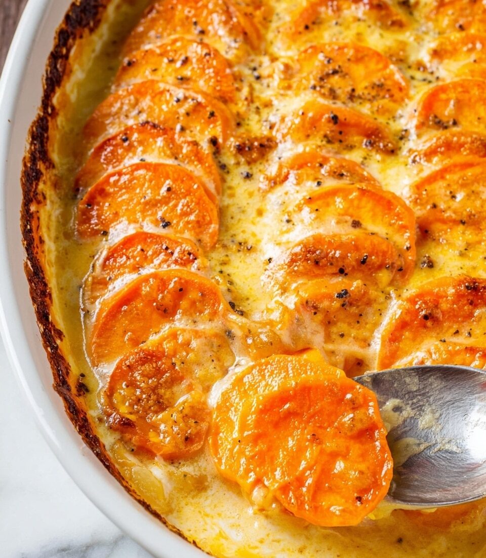 Keywords: scalloped sweet potatoes, cheesy sweet potatoes, baked side dish, comfort food, holiday side