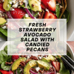 Keywords: Strawberry Avocado Salad, Candied Pecans, Spinach Salad, Summer Salad, Healthy Salad, Fresh Salad, Vegetarian Salad