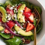 A fresh and vibrant Strawberry Avocado Salad combining baby spinach, ripe strawberries, creamy avocado, tangy feta, and sweet candied pecans, all tossed in a zesty homemade dressing. Perfect as a light lunch or a refreshing side dish.