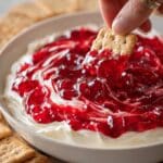 - Assemble and Serve: Transfer the mixture to a wide, shallow bowl and spread evenly. Spoon strawberry preserves on top and use a fork, toothpick, or knife to gently swirl the preserves into the cheesecake mixture. Serve with graham crackers, vanilla wafers, shortbread cookies, or cinnamon pita chips.