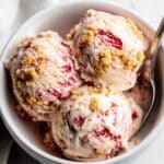 This Strawberry Cheesecake Ice Cream combines the rich, creamy texture of cheesecake with the fresh, tangy sweetness of roasted strawberries. Infused with vanilla and a hint of balsamic vinegar, this homemade ice cream features chunks of crispy graham crackers for added texture, creating a delightful dessert reminiscent of a classic strawberry cheesecake in frozen form.