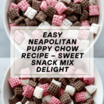 Sweet Easy Neapolitan Puppy Chow Snack Mix is a delightful, colorful treat combining three classic flavors: chocolate, vanilla, and strawberry. This fun twist on the traditional puppy chow uses layers of chocolate chips, white chocolate with vanilla, and white chocolate infused with strawberry gelatin powder, each coating crunchy Rice Chex cereal and dusted with powdered sugar for a perfect balance of sweetness and texture. Ideal for snacking, parties, or gifting.