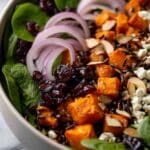 A vibrant and nutritious Sweet Potato Salad combining roasted sweet potatoes, baby spinach, wild rice, toasted almonds, and a tangy honey lemon mustard dressing. This salad balances sweet, savory, and nutty flavors, ideal as a hearty lunch or light dinner.