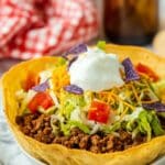 Keywords: Taco Bell Taco Salad, Tex-Mex taco salad, baked taco shell salad, ground beef taco salad, quick taco salad