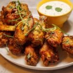 - Garnish and Serve: Once the wings are done, remove them from the oven and transfer to a serving platter. Garnish with sliced scallions. Serve hot alongside the chilled cilantro lime yogurt dipping sauce for dipping.