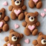 - Assemble Teddy Bears: After the cookies have cooled, use melted chocolate to attach the white chocolate muzzle, chocolate chips for the eyes and nose, and the pink heart decoration. Press gently to secure all parts in place.