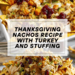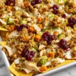 Keywords: Thanksgiving nachos, turkey nachos, holiday appetizer, leftover turkey recipe, stuffing nachos, cranberry sauce, easy baked nachos