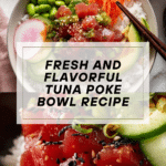 This Tuna Poke Bowl recipe features sashimi-grade tuna served over perfectly seasoned sushi rice, complemented by fresh vegetables like carrot, cucumber, radish, avocado, and edamame. The bowl is dressed with a flavorful combination of soy sauces, sesame oil, mirin, rice vinegar, chili paste, and ginger, creating a vibrant and refreshing dish inspired by Hawaiian and Japanese flavors. It’s an easy-to-make, healthy, and visually appealing meal perfect for lunch or dinner.