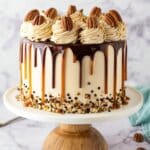A round cake with smooth light beige frosting is decorated with chocolate and caramel drips flowing down the sides. The top edge is topped with swirls of creamy frosting, each holding a whole pecan, with chopped nuts sprinkled around and on top. The base of the cake is lined with a mix of chopped nuts and tiny chocolate chips. The cake sits on a white round cake stand with a wooden base, placed on a white marbled surface. Photo taken with an iphone --ar 4:5 --v 7
