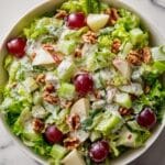 A classic Waldorf Salad featuring a creamy mayonnaise and lemon dressing tossed with crunchy apples, celery, sweet grapes, and toasted walnuts. Served on a bed of fresh lettuce, this refreshing salad balances sweet, tart, and nutty flavors for a light and satisfying dish.