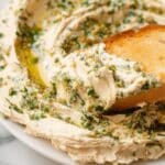 The image shows a close-up of creamy dip spread thickly on a white plate, with visible layers of smooth, light beige hummus base topped by a green herb and oil mix that adds texture and color contrast. A slice of toasted bread with a golden crust is dipped into the creamy mixture, highlighting the dip’s soft and rich texture. The herb mix appears finely chopped with small green flecks scattered over the dip, creating a fresh and appetizing look. The background features a white marbled surface. photo taken with an iphone --ar 4:5 --v 7