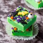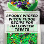 Wicked Witch Fudge is a fun and festive treat perfect for Halloween or any spooky occasion. This creamy, sweet fudge combines white chocolate and marshmallow cream with a playful twist of green coloring and spooky decorations.